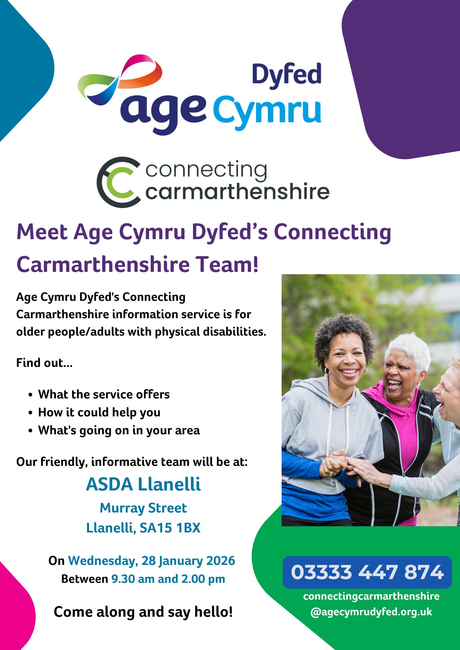Come and meet Age Cymru Dyfed’s Connecting Carmarthenshire team! We will be at Asda Llanelli (Murray Street, Llanelli, SA15 1BX) on Wednesday, 28th January 2026 from 9.30 am-2.00 pm. Find out what the service offers, how it could help you, and what’s going on in your area – whether you’re facing age-related difficulties, need help with correspondence, or don’t know where to turn, we’ll be there to help you. We look forward to seeing you.