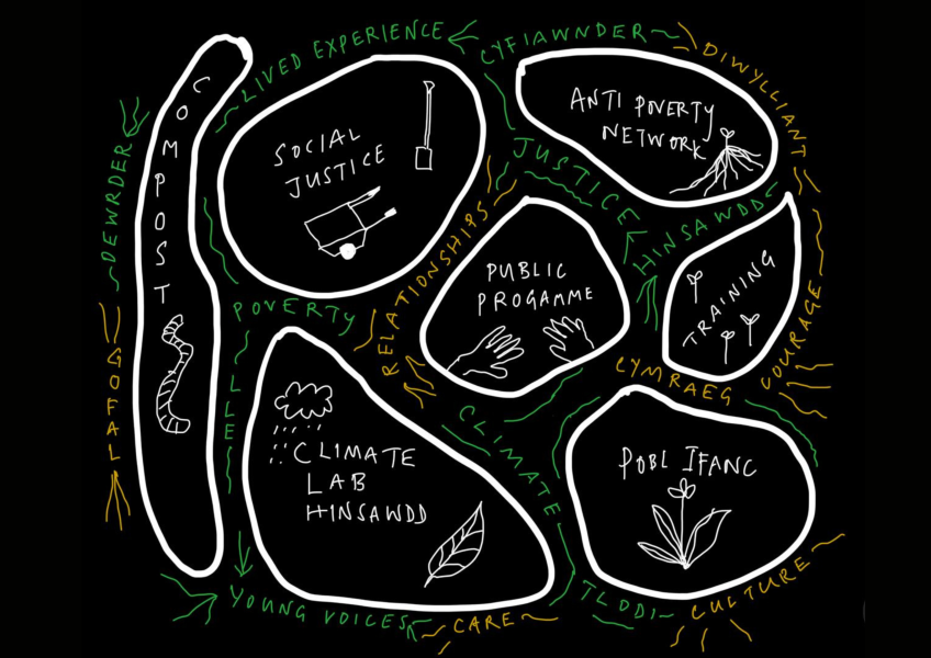 Ond pam rydyn ni'n siarad am gompost? Wel, mae'n gysylltiedig â'r syniad hwn ein bod ni'n hwyluso newid, yn cynaeafu ein canlyniadau, ac yn compostio ein dysgu. Gan ddefnyddio cyfatebiaeth yr ardd i ddisgrifio cyfres gymhleth o gydweithrediadau a syniadau. Canolbwyntiodd ein sesiynau blaenorol ni ar gamau ymarferol wrth i ni fapio a chofnodi pob agwedd ar ffyrdd presennol, newydd a photensial o weithio a beth fydd amcanion pob parth.