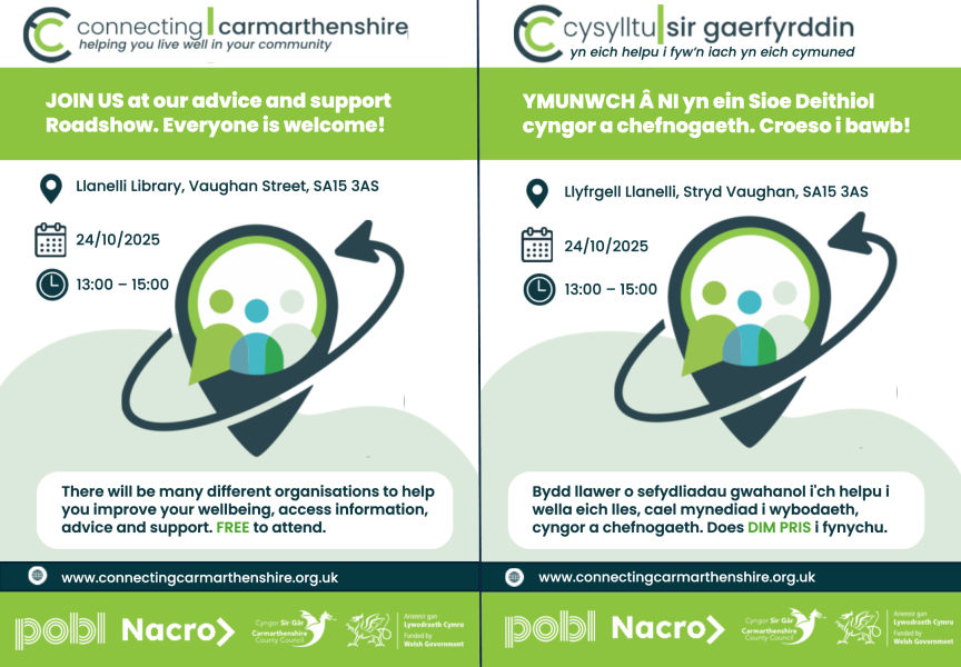 Join us upstairs in Llanelli Library from 1pm - 3pm on Friday October 24th for our free information and advice event including support from;