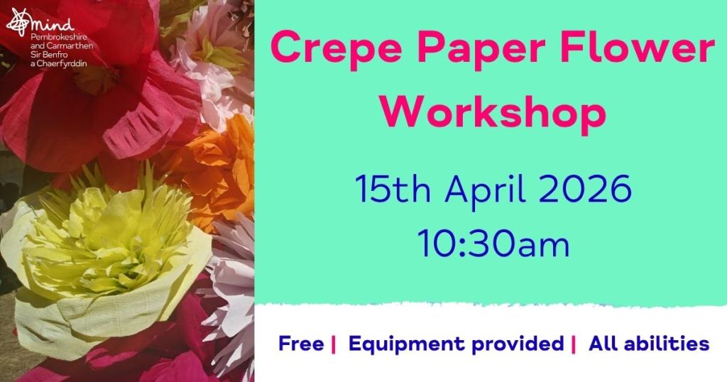 Wellbeing Wednesdays at Mind Carmarthen- Free craft workshop- Let's make crepe flowers together! All abilities welcome. 15/04/2026 at 10:30-12:30 Where? Mind Carmarthen, 132B Priory Street