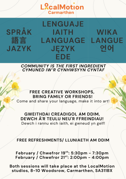Join us on this February for a set of art filled drop in session, focused on celebrating and identifying the many diverse languages spoken here in Carmarthen town.