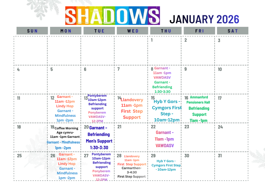 Shadows January Calendar of Whats on what support is avaialble in Carmarthenshire with Shadows