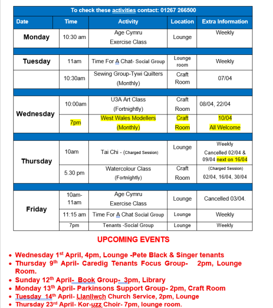 Please see image of all events/activities being held by Cartref Cynness.