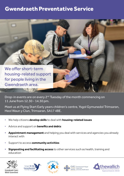 Drop in support sessions offering short term housing related support in the Trimsaran area.