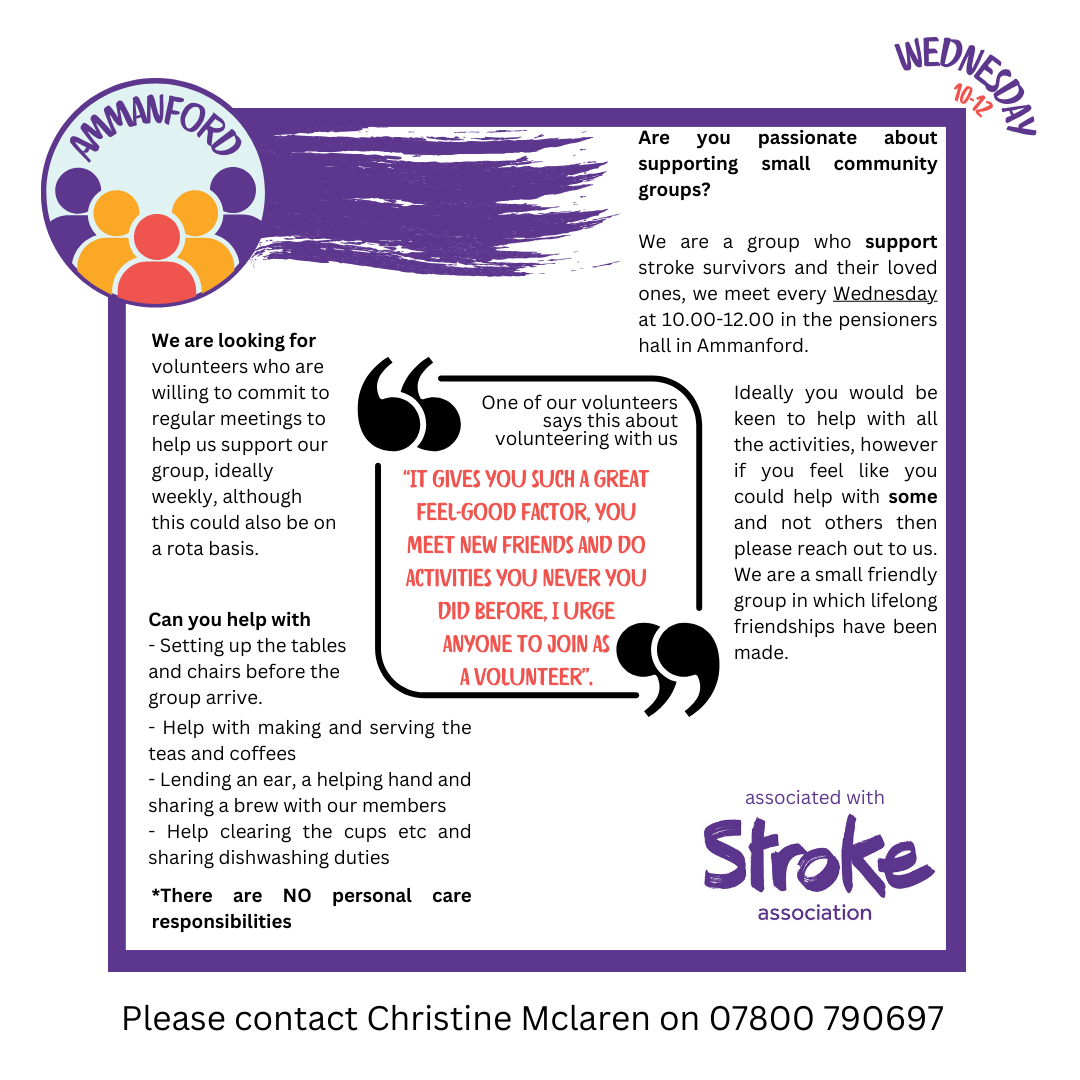 Life After Stroke (Ammanford) is a friendly independent group, recommended by the Stroke Association and part of the stroke group network. It is open to anyone affected by stroke, including stroke survivors, carers, friends and family members. The group aims to reduce isolation, redefine and reclaim skills, aid adjustment to stroke-related disability and increase confidence. You will find plenty of peer support, interesting activities and of course tea and biscuits.