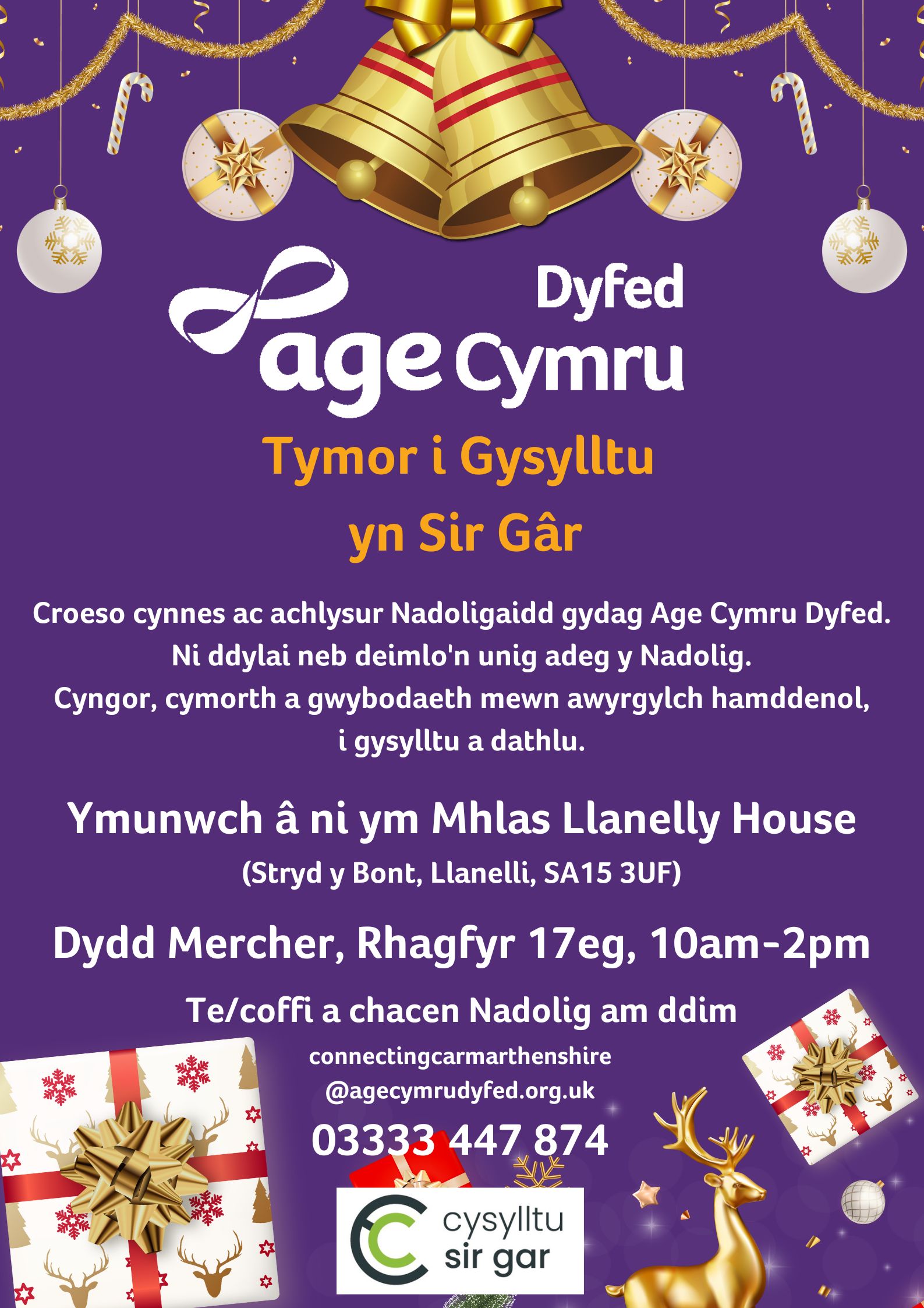 Digwyddiad galw heibio anffurfiol fydd hwn i ddarparu gwybodaeth, cyngor, a chymorth, gyda’r ffocws ar atal unigrwydd adeg y Nadolig. Bydd partneriaid sefydliadol tîm Cysylltu Sir Gâr Age Cymru Dyfed yn ymuno â ni gyda gwybodaeth am wasanaethau fydd ar gael dros ŵyl y Nadolig, a bydd gan Age Cymru Dyfed lyfrynnau ‘Lleoliadau Prydau Nadolig Cymunedol’ i helpu pobl i ddod o hyd i rywle i fynd i gael cinio Nadolig gydag eraill.